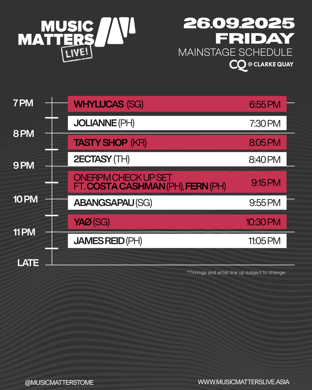 Music Matters Live 2025 will feature 42 artists, representing 18 countries, across 4 nights of Live Music. Witness the artists making waves in APAC and beyond at Music Matters Live, featuring artists from Singapore, Philippines, Australia, Aruba, Japan, Indonesia, India, Norway, UK, Vietnam, South Korea and more..